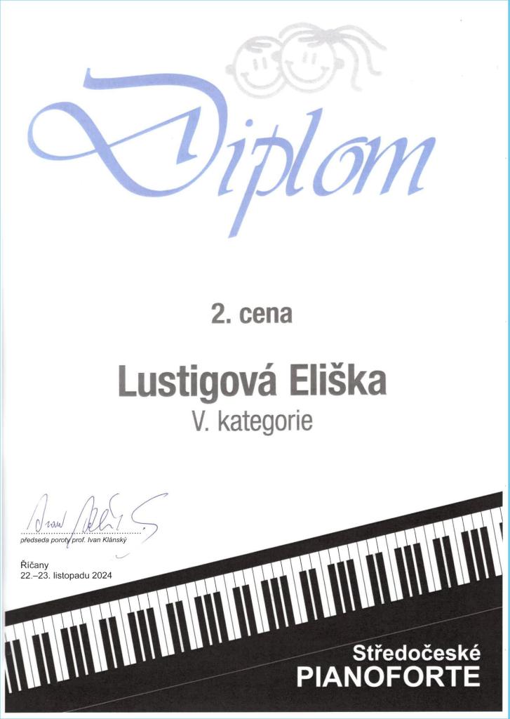 Gratulujeme naší žákyni Elišce Lustigové k získání 2. ceny v V. kategorii klavírní soutěže Středočeské pianoforte.
